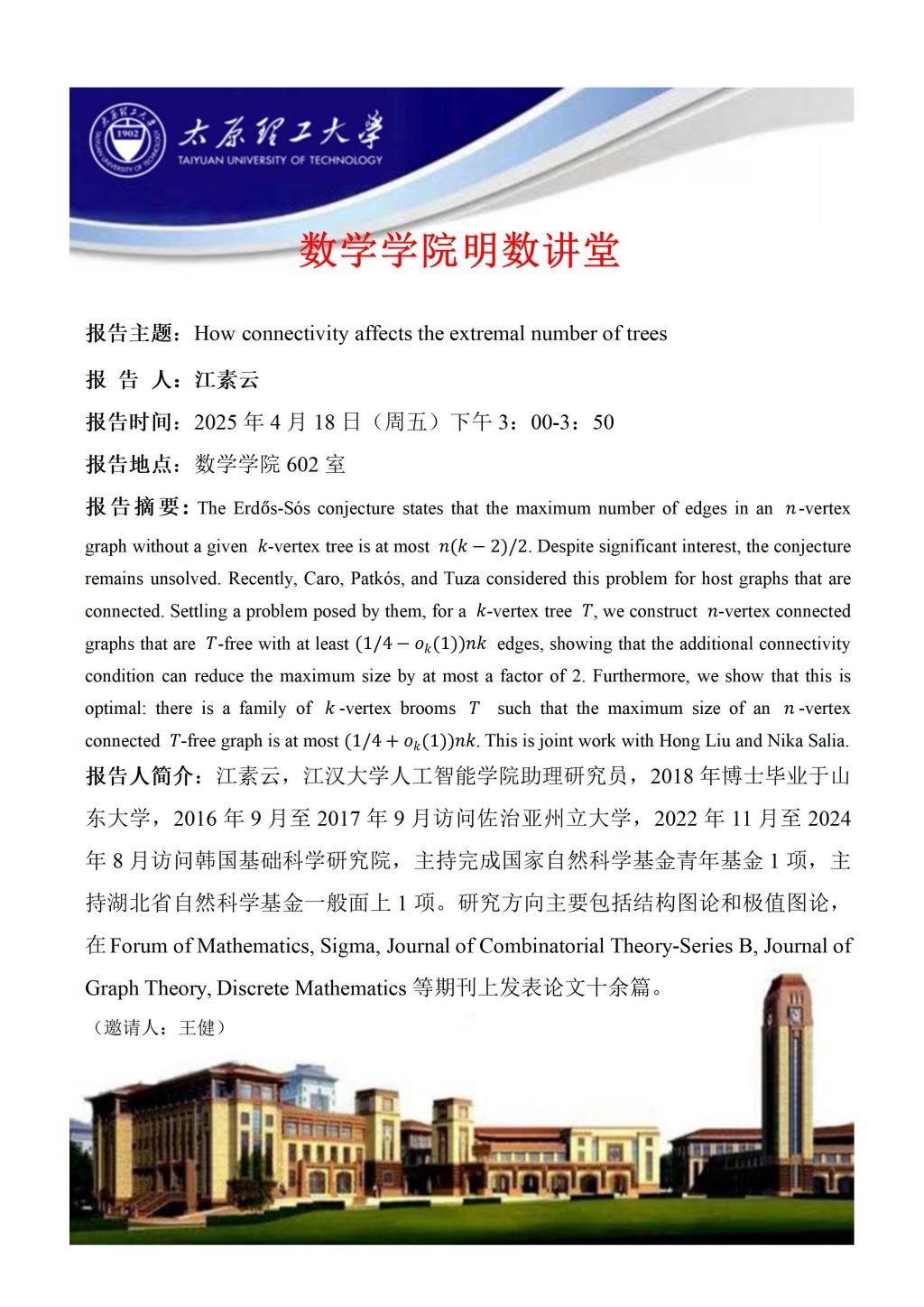 报告人简介:江素云,江汉大学人工智能学院助理研究员,2018年博士毕业于山东大学,2016年9月至2017年9月访问佐治亚州立大学,2022年11月至2024年8月访问韩国基础科学研究院,主持完成国家自然科学基金青年基金1项,主持湖北省自然科学基金一般面上1项。研究方向主要包括结构图论和极值图论,在Forum of Mathematics, Sigma, Journal of Combinatorial Theory-Series B, Journal of Graph Theory, Discrete Mathematics等期刊上发表论文十余篇。